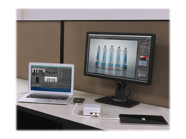 Grâce à la station d'accueil pour ordinateur portable, il devient facile de transformer votre ordinateur portable en poste de travail à deux écrans et à haut rendement, en étendant l'espace de votre écran sur un écran HDMI et un écran DVI. Cet espace d'écran supplémentaire vous permet de travailler plus efficacement, car vous n'avez plus besoin de passer d'une page et d'une fenêtre à l'autre. De plus, vous pouvez combiner cette station à l'écran de votre ordinateur portable pour créer un poste de travail à trois écrans.