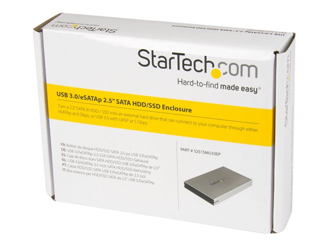 Le boîtier de disque dur USB 3.0/eSATAp S251SMU33EP permet de transformer un disque dur (HDD) SATA 2,5 pouces ou disque SSD en un disque dur portable externe, pouvant être connecté à tout système informatique USB ou eSATA.